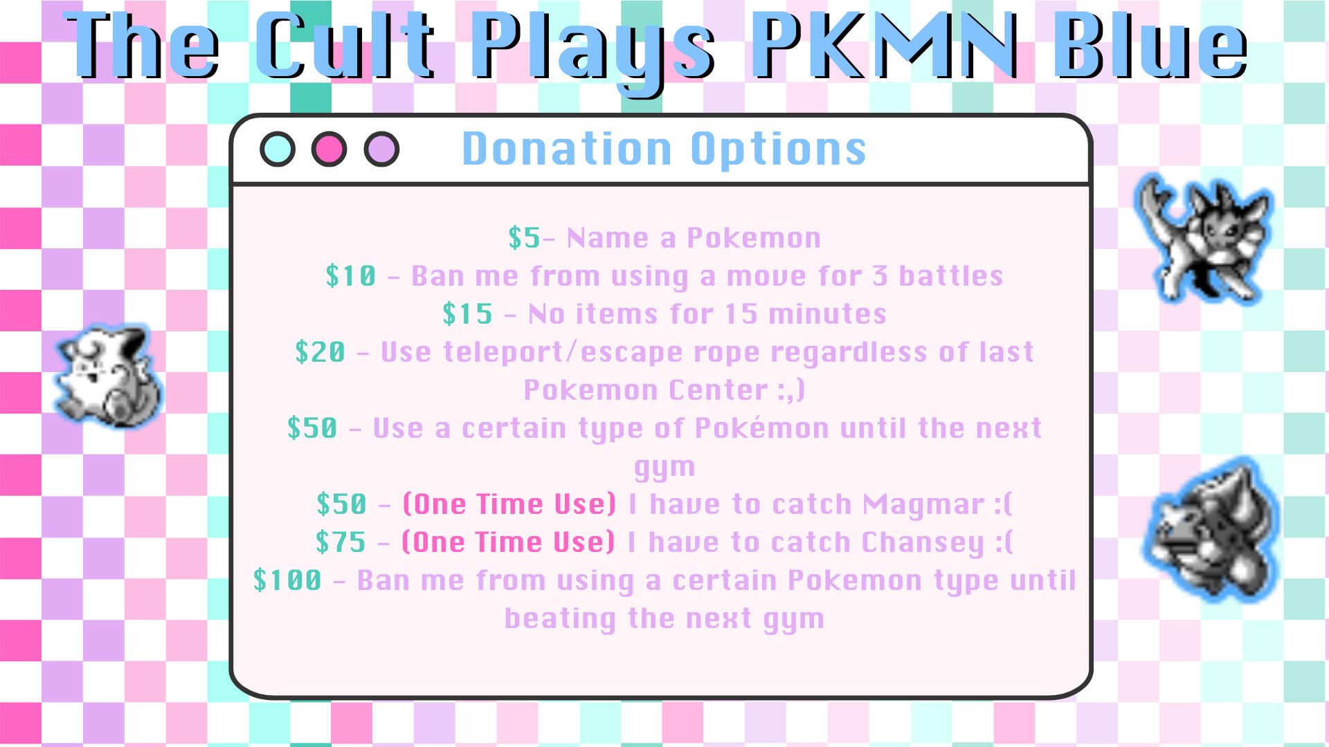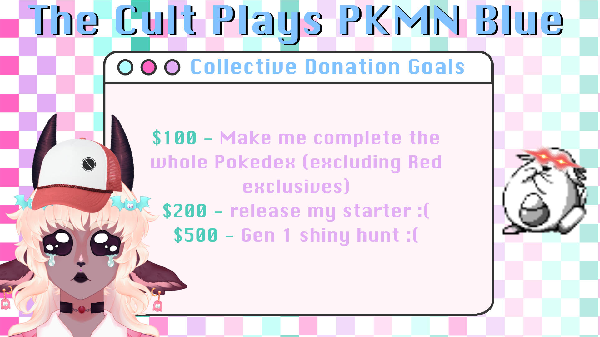 The Cult Plays PKMN Blue will start at 12pm PST/3pm EST on September 20th, 2025!! Make sure to come out and bully support your favorite goat during her journey through Kanto!You can donate to aid or hinder Eden as she fights Team Rocket, conquers the Elite 4, and tries not to cry after getting sent back to the Pokémon Center.